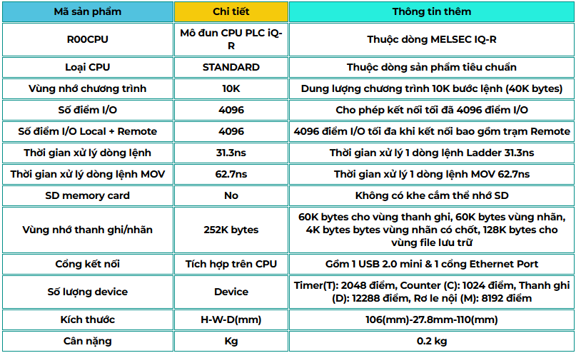 R00CPU là một trong những bộ điều khiển trung tâm thuộc dòng PLC iQ-R của Mitsubishi, được thiết kế để đáp ứng nhu cầu tự động hóa cơ bản nhưng với hiệu suất cao. Với tốc độ xử lý nhanh và ổn định, R00CPU phù hợp cho các ứng dụng điều khiển quy mô vừa và nhỏ, giúp tối ưu hóa quá trình vận hành sản xuất. Sản phẩm này tích hợp nhiều tính năng mạnh mẽ như điều khiển logic, giám sát từ xa, và khả năng mở rộng I/O linh hoạt. Đây là giải pháp lý tưởng cho các doanh nghiệp cần sự ổn định, tiết kiệm chi phí và dễ dàng tích hợp vào hệ thống hiện tại.